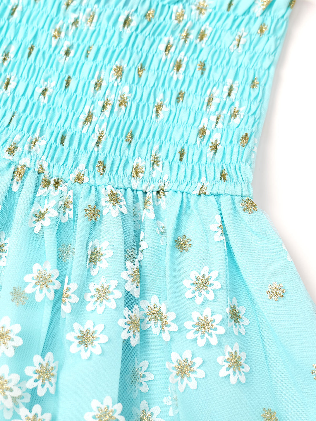 This charming blue net dress features spaghetti straps and a smocked bodice for a snug, comfy fit. Adorned with white and golden daisy embroidery, it offers a fresh, whimsical look. The flared net skirt adds graceful movement, perfect for parties, festive occasions, or sunny summer outings.