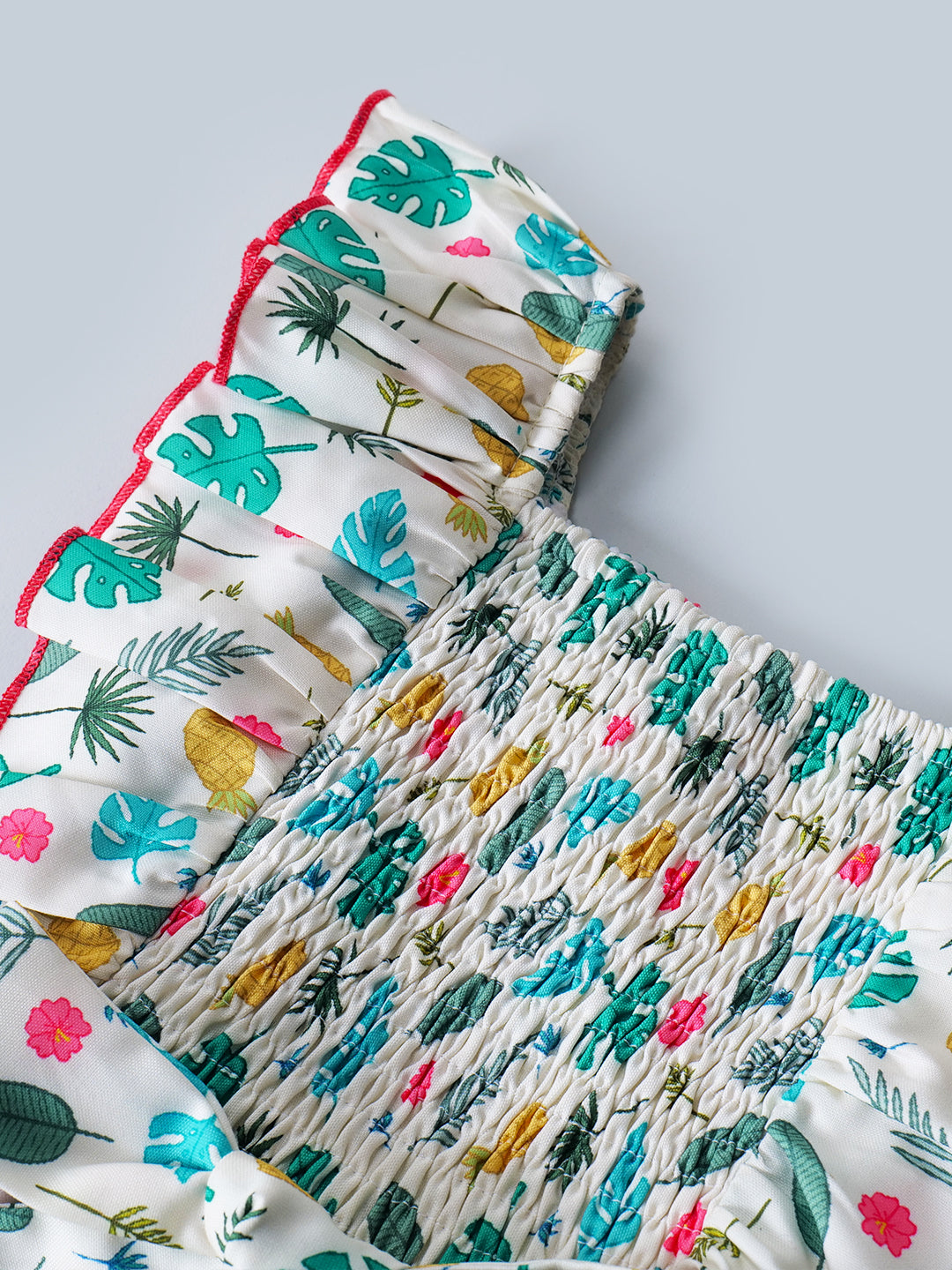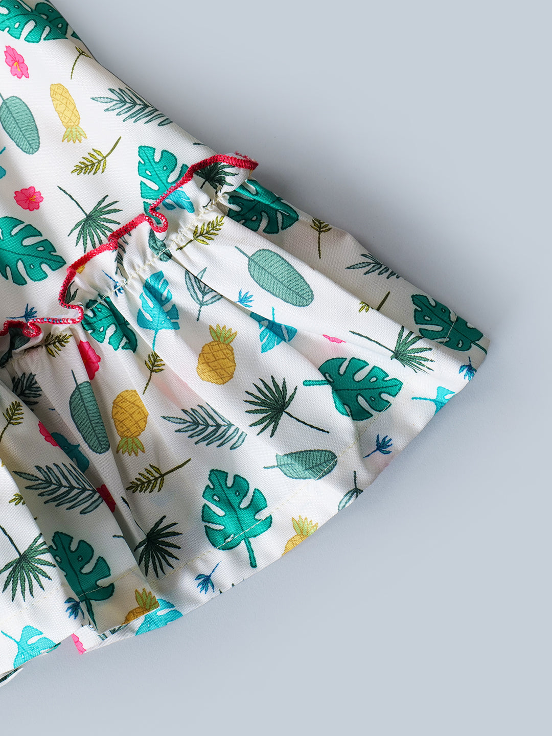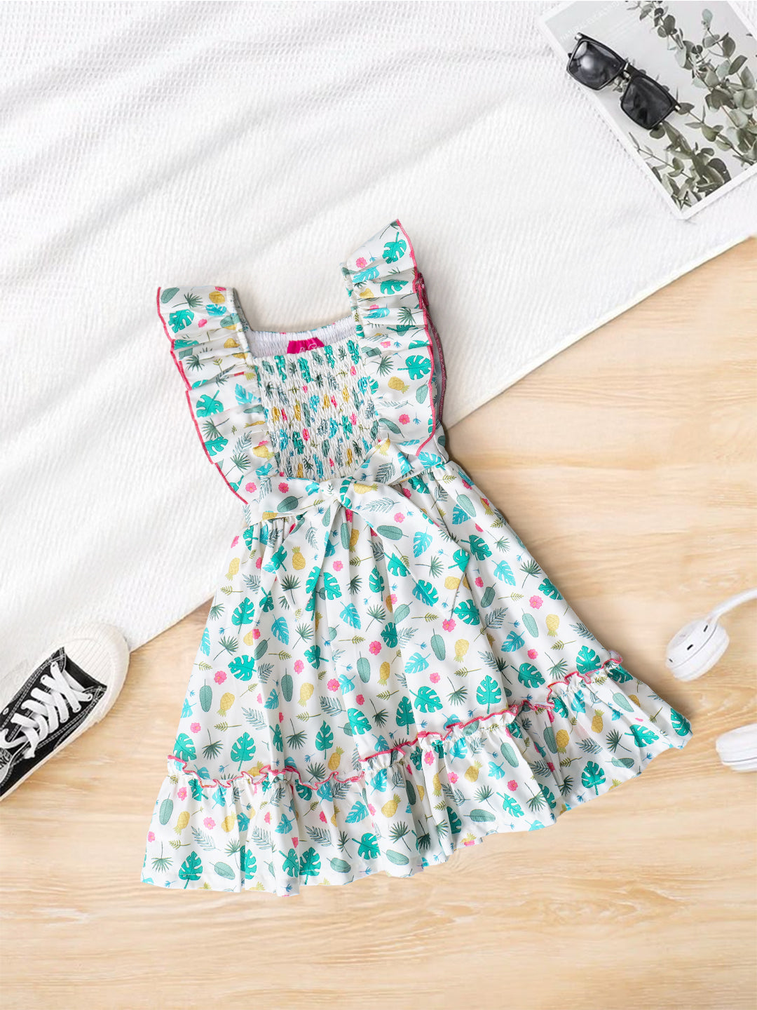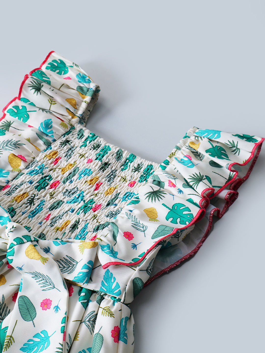 This white rayon dress features a vibrant tropical leaf and fruit print in green, yellow, and pink. It has a round neck, sleeveless design with ruffled straps, a smocked bodice for comfort, a waist bow, and a ruffled hem with pink stitching—perfect for a playful, summery look.